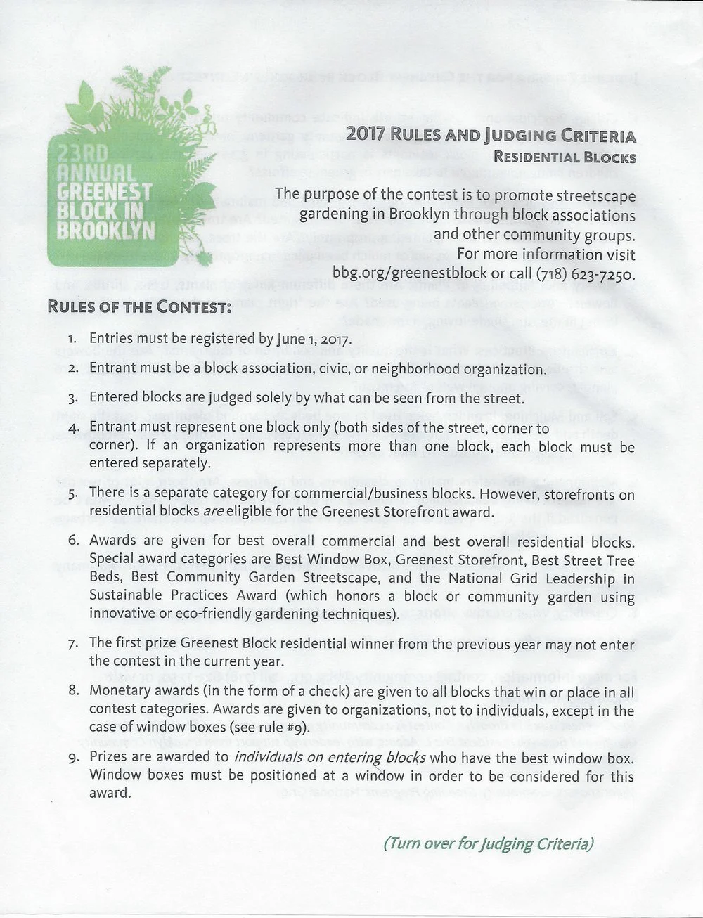 The purpose of the Greenest Block in Brooklyn Contest is to promote streets cape gardening, tree stewardship, and community development in the borough of Brooklyn through block and merchant associations and other community groups. Winners will receive cash prizes or gardening tools, and all participants will be awarded a “recognition certificate”. For All Judging Criteria for "Greenest Block in Brooklyn" Contest please go to http://www.bbg.org/greenbridge/greenestblock for details.